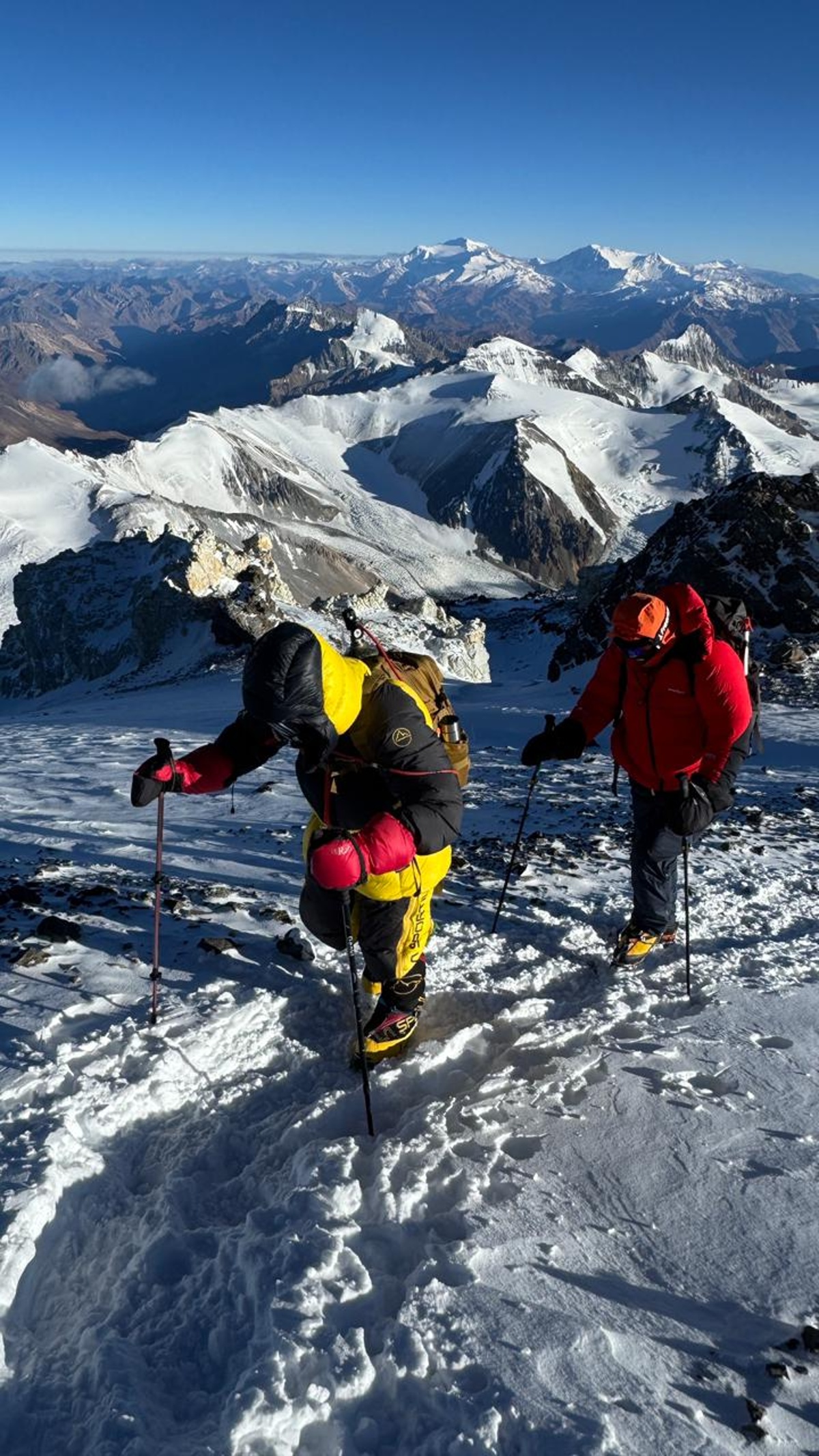 Presun do Argentíny prebehol napodiv podľa itineráru cez Limu do mesta Mendoza, známeho super červeným vínom Malbeck. Tu som si požičal páperovú bundu, a zistil že mi chýba sacia hadička na benzínovom variči, ktorý je propagovaný ako univerzálny na benzín aj plyn. Keďže benzínová časť bola nefunkčná, kúpil som plyn, vymenil trysku a odskúšal na hoteli – super išiel ako ďábel. Po presune do Penitentes a odovzdaní batožiny na odvoz mulmi do base campu som konečne po absolvovaní formalít na vstupe do národného parku začal výstup na svoj hlavný cieľ – Aconcagua. Išiel som klasickou trasou cez údolie rieky Horcones. Výstup do 1. a 2. tábora (Plaza de Mulas) prebehol relatívne hladko za 2 dni s krásnymi výhľadmi na okolité štíty a za pekného počasia. V Base Campe (plaza de Mulas) som si dal 1 deň oddych a pripravil si veci na výstup. 29.1. som vystúpil do Camp Canada vo výške 5000m a tu po poobedňajšej búrke s krupobitím som zistil, že môj varič funguje na plyn len v nízkych nadmorských výškach a v tejto výške odmietal horieť. To je na Aconcagua dosť veľký problém, pretože nikde nie je voda a treba topiť sneh. Z predpovede som vedel, že na výstup na vrchol je najlepší deň 2.2., pretože od 3.2. stúpala pravdepodobnosť búrok a víchrice. Musel som zostúpiť 30.1. späť do base campu a požičať si dobrý varič. Na výstup mi zostali prakticky 3 dni. Začal som pochybovať, či sa to bude dať. V plnej poľnej (čiže ak by som niesol 20kg batoh s výstrojou) bez oddychu som to vyhodnotil ako nereálne, tak som najal šikovných mladých nosičov, čo mi vyniesli výstroj a ja som naľahko, len s oblečením, pitím a svačinou v batohu vyrazil na „one push“ výstup. Prvý deň priamo z base campu 4200 m n.m. do Nido de Condores vo výške 5400m (vynechal som camp Canada), ďalší deň do camp Cólera vo výške 6000m, a tretí deň 2.2. sa mi podarilo vytlačiť to o 15,30 až na vrchol. Samozrejme v rámci Murphyho zákonov mi odišla batéria vo foťáku a aj mobil sa vybil napriek pobytu v spacáku a nechcel sa zapnúť, takže som musel požiadať kamarátov aby ma pofotili. Na zostupe prišla víchrica, ktorá mala prísť až o deň neskôr, takže to celkom chytilo grády a zostup do camp Cólera bol náročnejší. Víchrica trvala celú noc a polámala viacero stanov campe, čo malo za následok nariadenú evakuáciu tábora na druhý deň kvôli očakávanému týždňu búrok a vetra. Dolu som už celú výstroj zniesol sám na jeden záťah až do base campu. Ďalší deň nasledoval 27 km pochod vysokohorskou púšťou z Plaza de Mulas ku vstupu do parku, kde ma už čakal odvoz do Mendoza. Mal som toho celkom dosť po 5 náročných dňoch a tešil som sa na steak a víno v Mendoze.